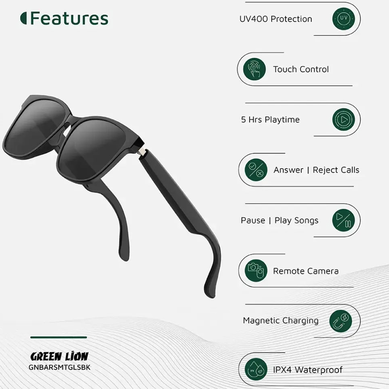 عینک آفتابی هوشمند گرینلاین Green Lion GNBARSMTGLSBK/ GL-SG8