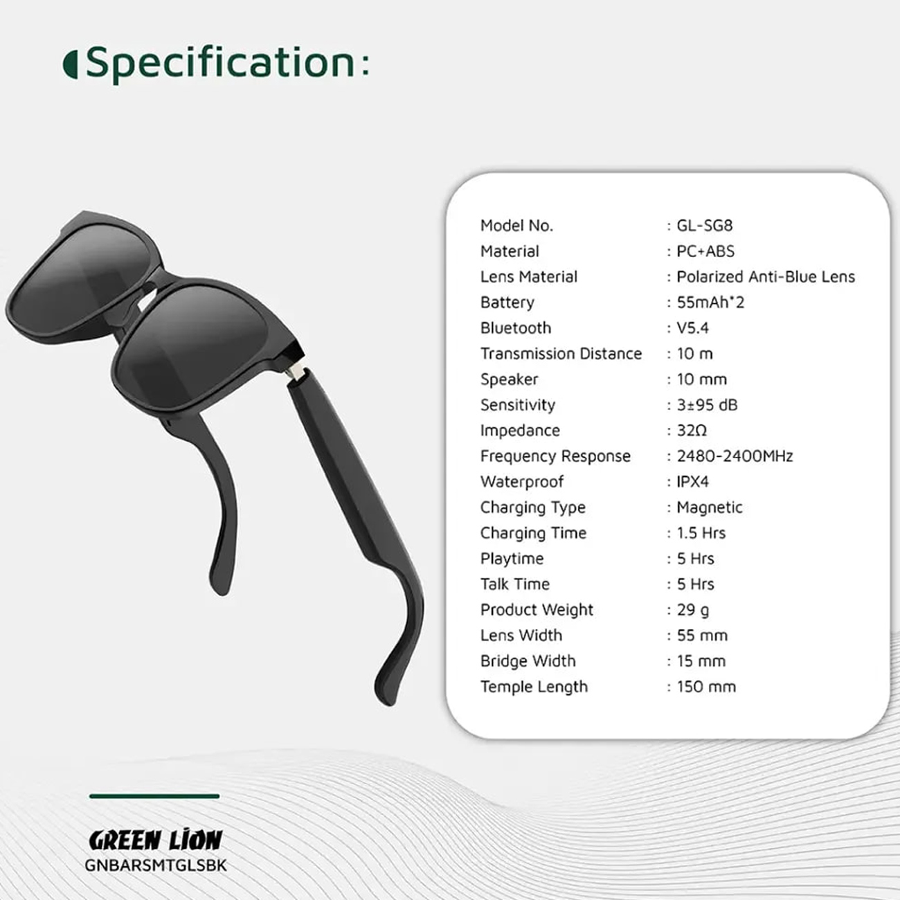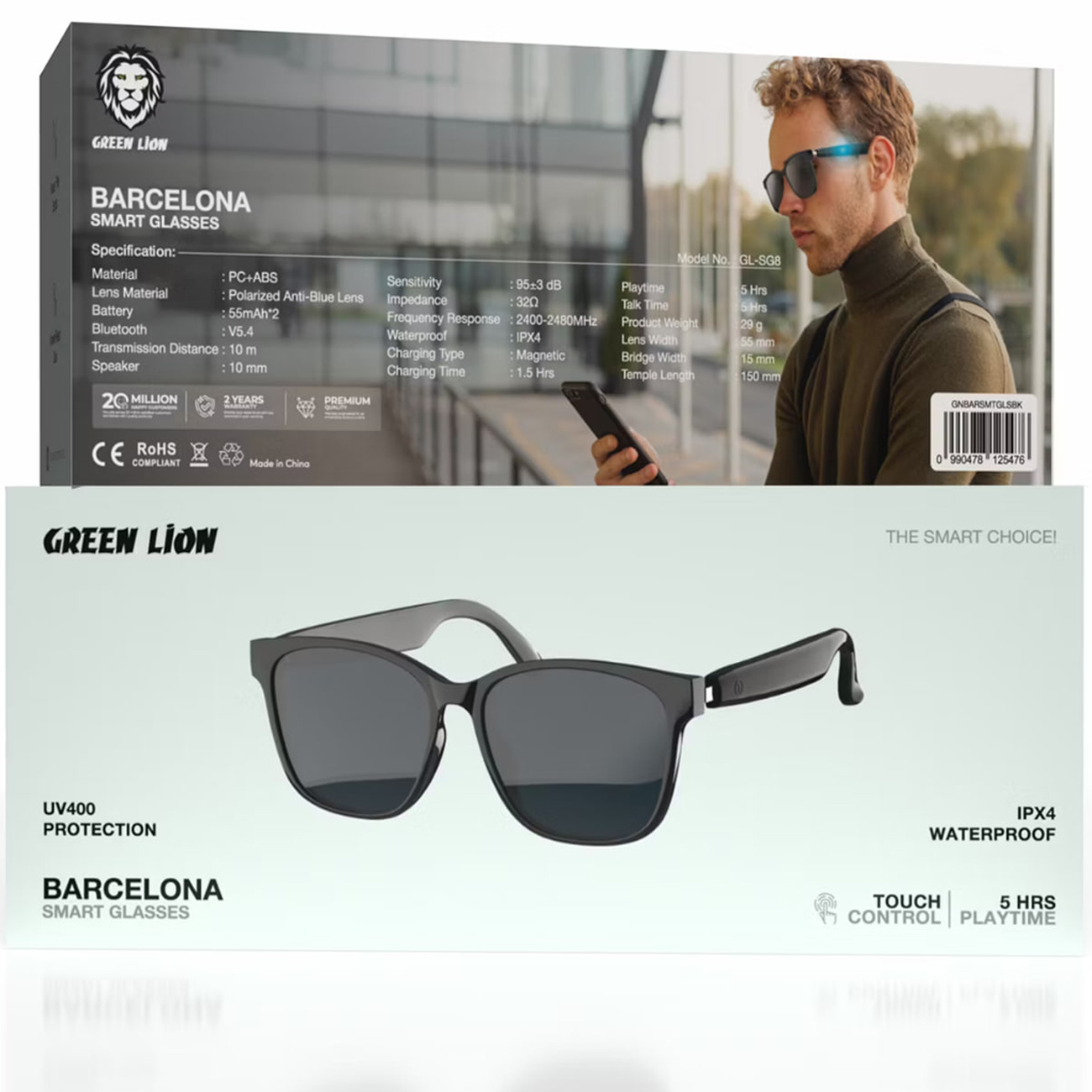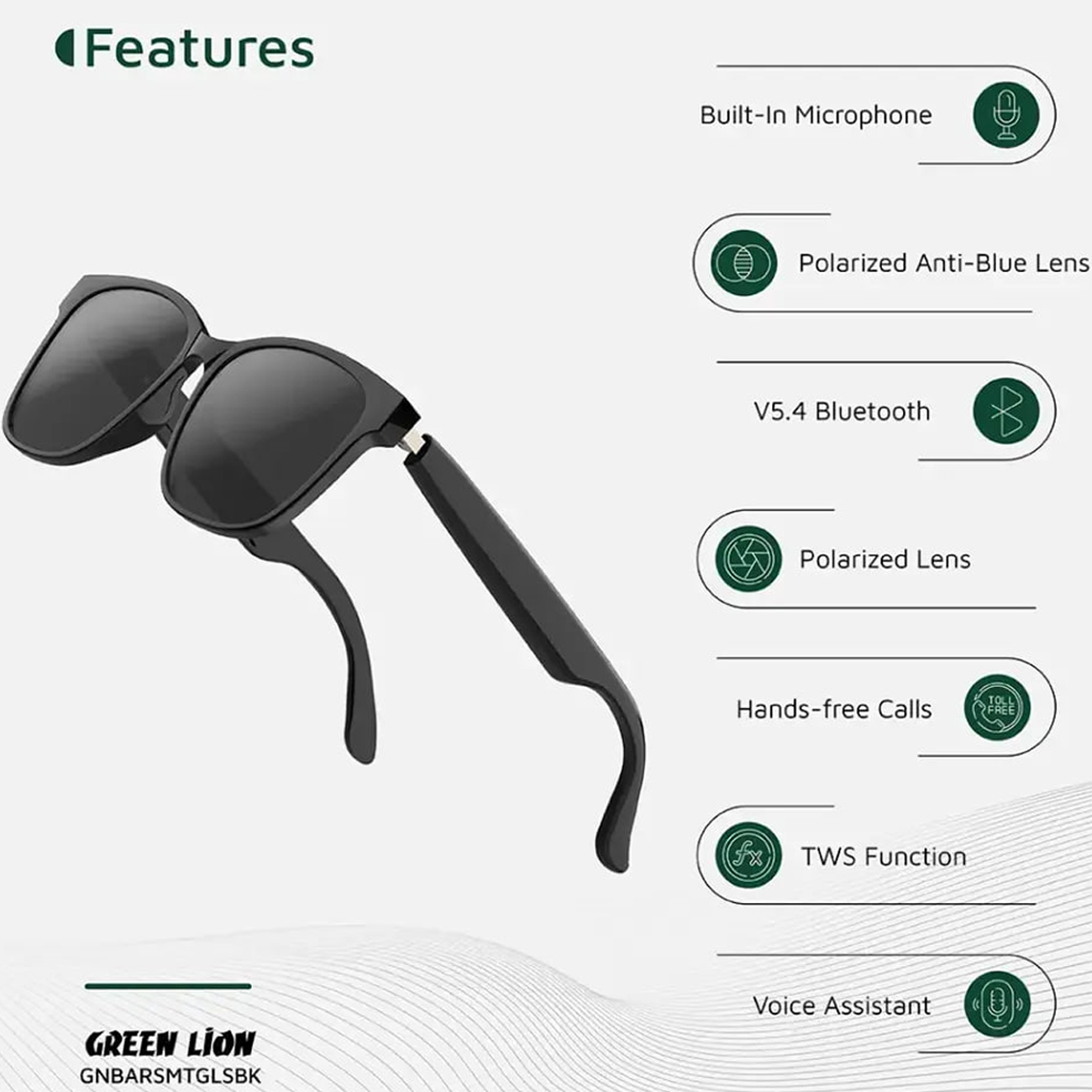 Green Lion Barcelona Smart Glasses GNBARSMTGLSBK/ GL-SG8 Polarized Anti-Blue Lens, Built-in Microphone, UV400 Protection TWS Function