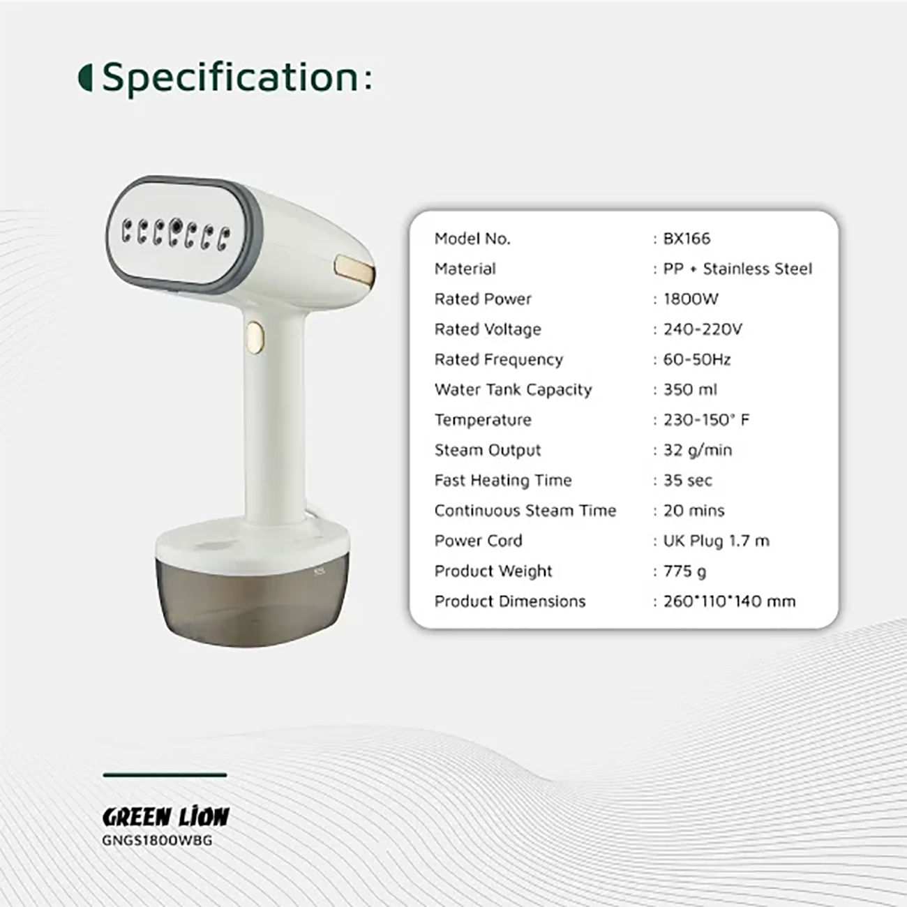Green Lion STEAM BX166 1800W Garment Steamer GNGS1800WBG