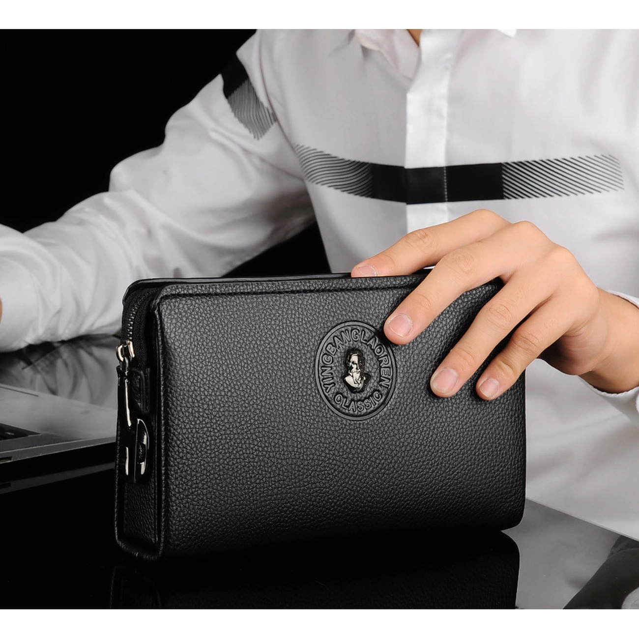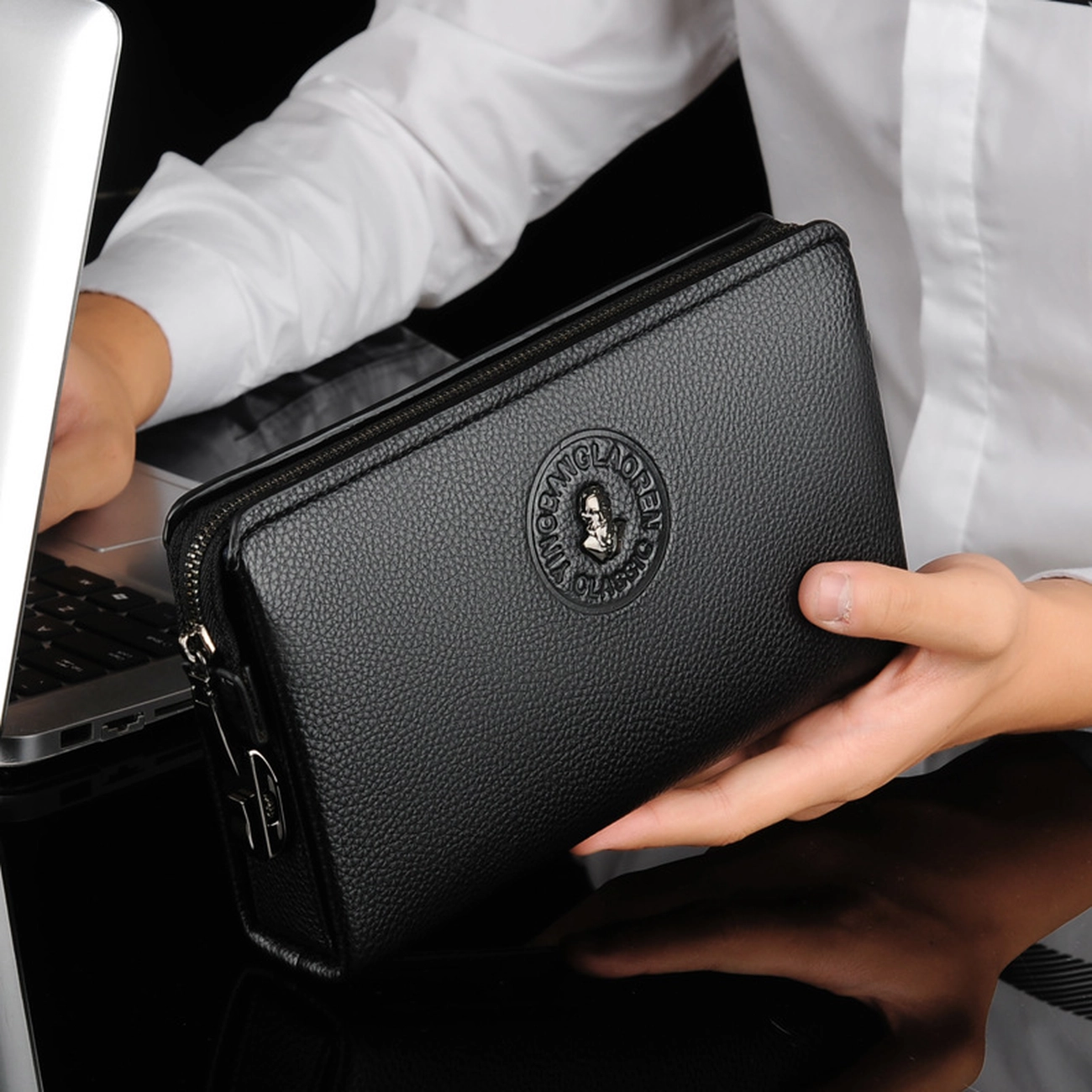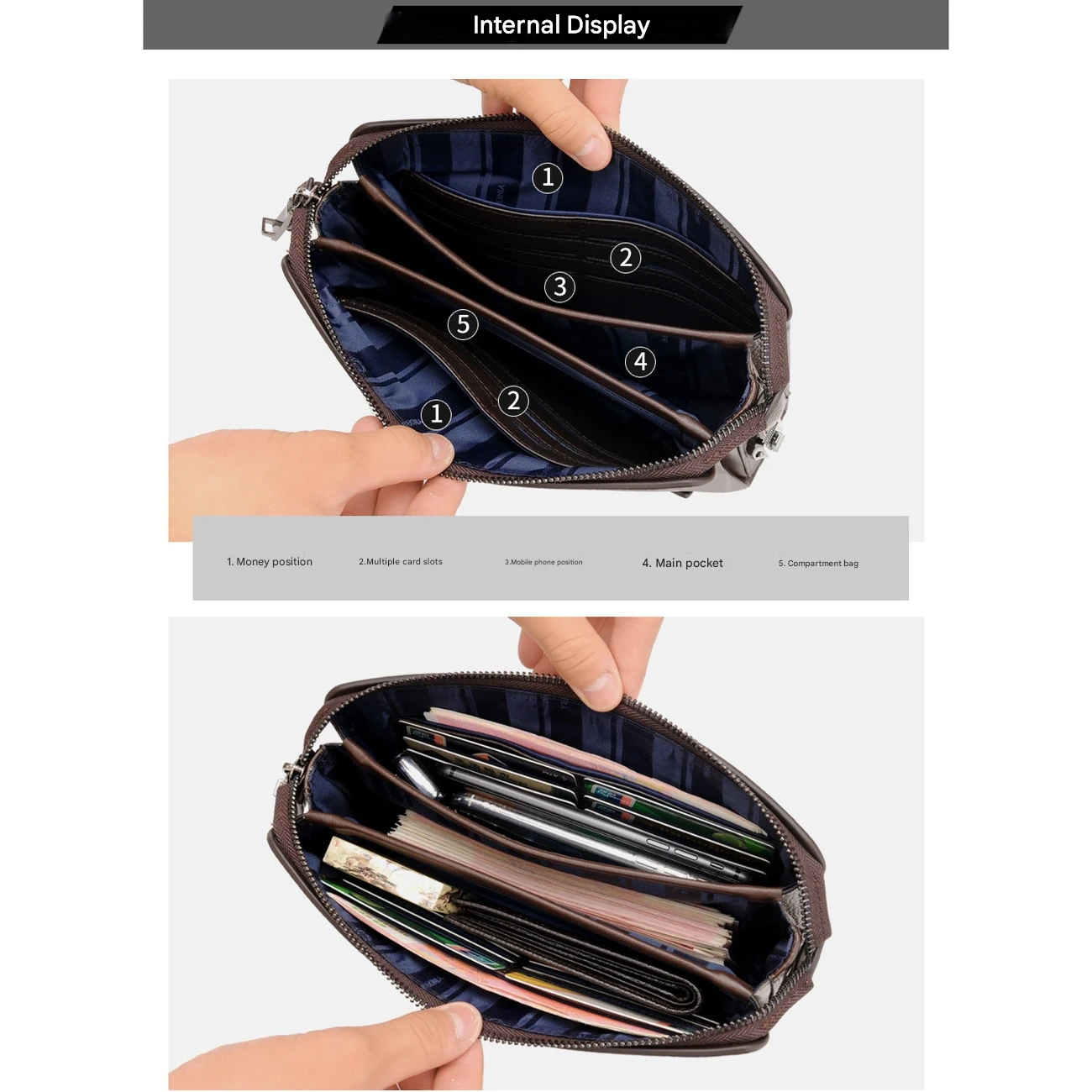 | فضای داخلی | محفظه اسکناس، اسلاتهای متعدد کارت، جیب موبایل، جیب زیپدار داخلی |